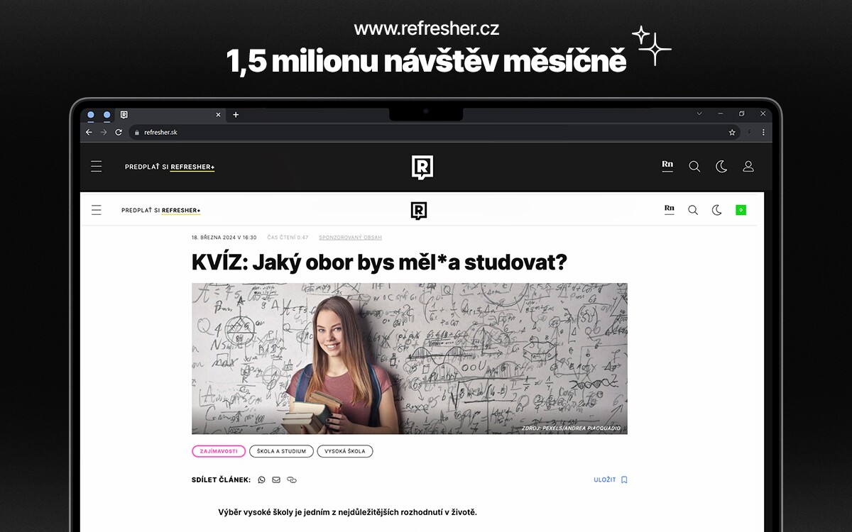 Na webu představíme vaši školu formou interaktivního kvízu či nativního článku, jehož téma vždy přizpůsobujeme konkrétnímu zaměření školy. Další možností je PR zpráva, kterou zpracovává klient, my se postaráme o editaci, aby měla co největší šanci zaujmout naše čtenáře.